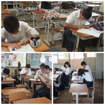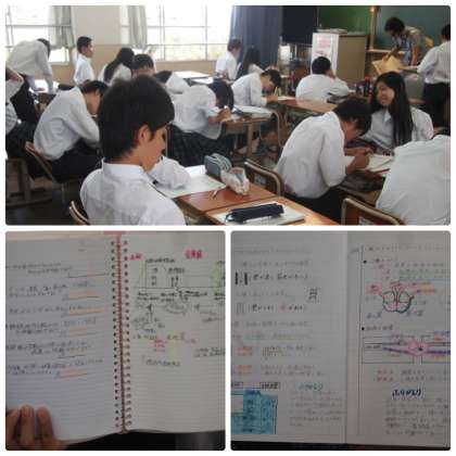 テスト公示日ですので,学習会及び質問会が始まりました。学習会は全員参加の形で約15分間です。質問会は希望者が残って学習・質問をするといったものです。学校祭・音楽コンクールからの気持ちの切り替えが必要となりますが,この学習会・質問会によって切り替えをするきっかけになればと願っております。写真を撮っていたら自分のノートを見せにきてくれました。それも載せておきます。きれいなノートですね。
