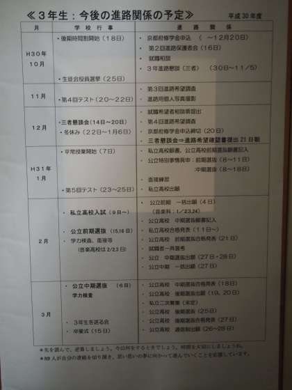 3年生の保護者の皆様には,今月末からの進路懇談,さらには11月の期末懇談の時にご来校いただくことになりますが,お子たちにとって最善の決定ができますようご協力よろしくお願いいたします。