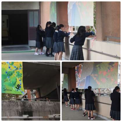 美術部がキッズゲルニカの取組において作成した絵をセッティングしてくれていました。前にもお知らせしたとおり,京都市あげて実施する「街ミュージアム」のひとつです。校門のところから見えるように設置してありますので通りがかった際にはご注目ください。