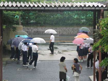 今日も朝から、あいさつ運動・ベル着、遅刻防止・節電のアピール運動が行われた。あいにくの雨の中、一生懸命声をかけていた。