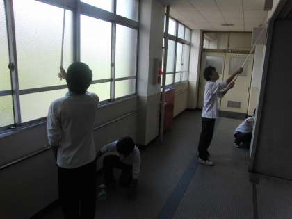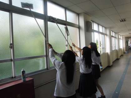 日常の清掃活動ではなかなかできていない、壁の汚れや高い場所の窓など委員会が積極的に取組むことで、全校生徒の校内美化の意識が高まればと放課後に活動が行われた。明日16日、21日の3回にわたって取組まれる。