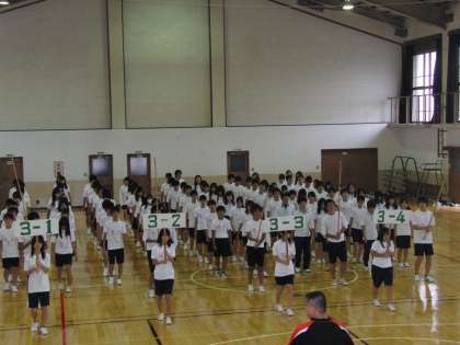 台風15号の影響を受け、雨天のため本日の体育大会にむけた2・3年の学年練習は、急遽体育館の中での練習となった。