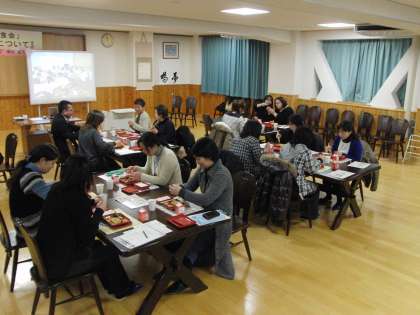 来年度入学される生徒の保護者を交え、給食試食会が開かれた。「中学校給食について」のテーマの下、教育委員会指導主事の方に講演をいただいた後、本日のメニューであるてんぷらを中心とした給食を試食した。