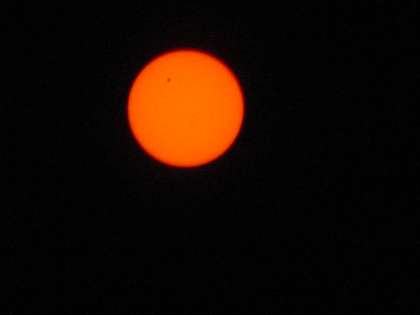 金環食につづき第2弾とも言える天体ショー「金星の太陽面通過」がありました。243年に2〜4回の割合でしか起こらず、次回は、100年以上先の話となります。学校の校庭より撮影に成功しました。左上部にに小さな点がありますが、それが金星です。宇宙の壮大さが感じられました。
