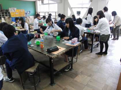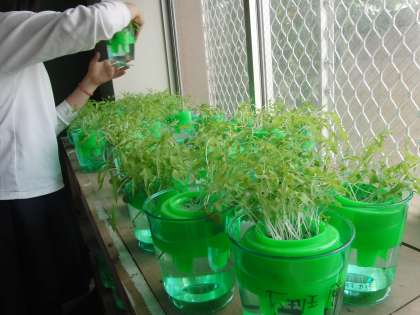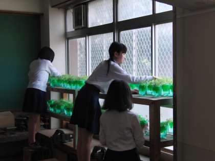 3年の技術の授業で、水菜の水耕栽培が行われています。3週間ほど前に植栽した水菜が大きくなりました。それもそのはず、朝登校すると一番最初に技術室に駆け込み、当番の生徒が水の調整をしています。何とも言えぬ、ほのぼのとした素敵な光景です。