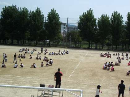 13日(木)体育大会へ向けて、1年生の学年別練習が行われました。学年団体種目の各クラスの位置などを確認しました。