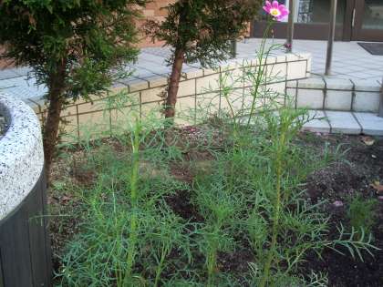 玄関の花壇に植えてあるコスモスが開花し始めました。種を蒔いてから約2ヶ月・・・はじめて咲いた花の色は「ピンク」。これから秋には次々と花を咲かせることでしょう。