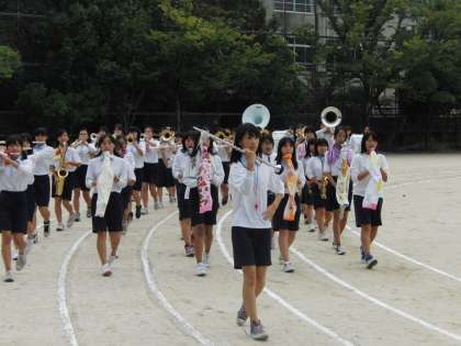 明日の体育大会予行にむけて放課後準備が行われました。準備終了後には、吹奏楽部と生徒会本部の入場練習が行われました。グランドに響く吹奏楽部の音色は、毎年聞いても心地よく、勇気がわいてきます。そして、いよいよ本番なんだと気持ちをかき立てます。