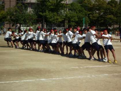3年団体競技「綱引き」が始まりました。クラス全員が一致団結し、渾身の力をこめて綱を引いています。「綱引き」の次は、来賓・保護者・職員による競技です。来賓・保護者・職員による競技は14時20分ごろの予定です。