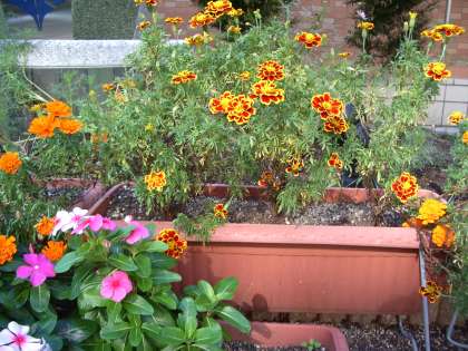 玄関にあるプランターのマリーゴールドが、咲き続けています。そしてまだまだ蕾をつけています。用務員さんが咲き終わった花を摘み取って下さっているのが、咲き続けている理由です。日々草もがんばっています。