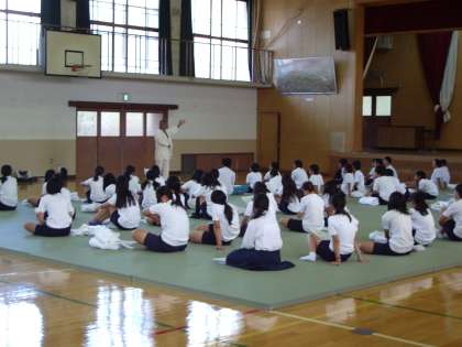 体育の授業で「柔道」が始まりました。最初は柔道着の着用のしかたを先生より教えてもらい、実際に着用してみました。