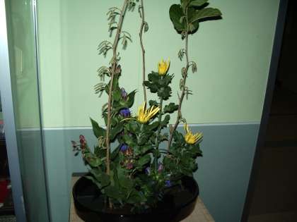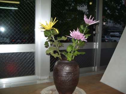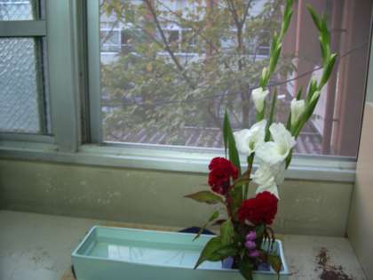 玄関に新しい活け花が秋を演出しています。黄色やパープルのキクが、真紅のケイトウが廊下や職員室に飾られています。