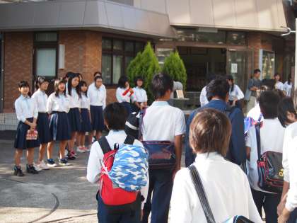 生徒十訓の定着と実践をより充実させるために、毎月10日を「生徒十訓の日」とすることが、生徒会・代表委員会に諮られ制定された。そして、この十月から取組が始まった。朝校門では、生徒会本部役員の生徒と有志によるアピールが行われた。また、8:30からは、放送により全校生徒の唱和が行われた。「生徒十訓をより意識して今日一日を過ごそう」と行われたものである。向島中学校に入学し、卒業するころには生徒十訓が実践できる生徒となるために、全校生徒で努力してほしい。みんなで頑張ろう!