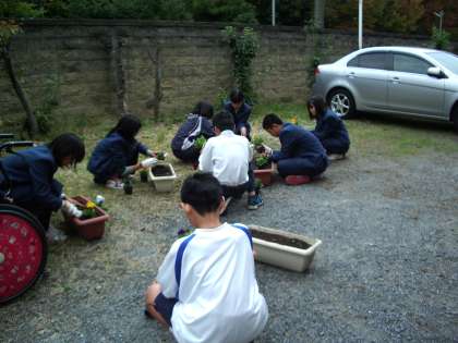 2日(金)の放課後、前期環境委員会で玄関に並べる花の植え込みを行いました。パンジーの花の苗がズラリと玄関に並びました。これから来年の春まで、成長を続けながら開花していくことでしょう。環境委員の皆さんご苦労様でした。