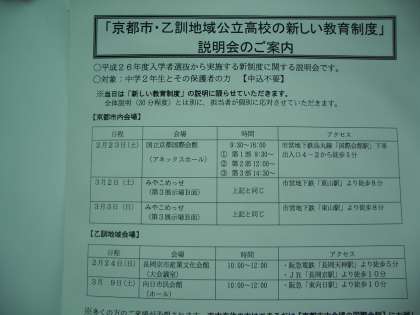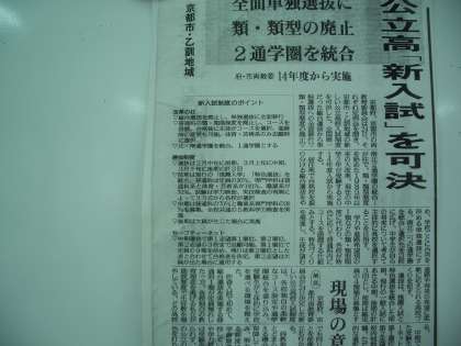 京都市・乙訓地域公立高校の、平成26年度選抜からの新しい入試制度が、本日の新聞で発表されました。2月から3月にかけて、中学2年生とその保護者に対する行政による説明会が予定されています。