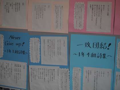 1年の階に行ってみるとたくさんの学習の成果が掲示してある。自分の選んだ百人一首のレポートや創作された詩、そしてその詩を読んだ生徒の鑑賞文。一つ一つつぶさに見ていくと大変おもしろい。なぜか、「この調子この調子」と微笑んだ。