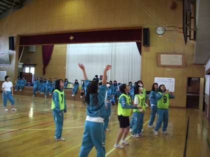 3年生球技大会、女子はバスケットボールを行っています。ゴールが決まるごとにクラスから拍手と歓声があがっています。