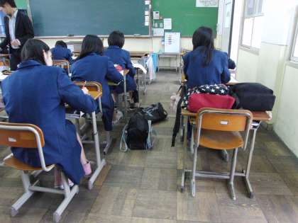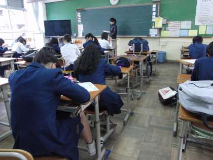 総括考査1週間前に入り、放課後「復習」のための学習会で勉強しています。今日は2年生の学習会の様子を見て回りました。みんな復習プリントに挑んでいました。