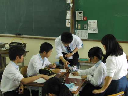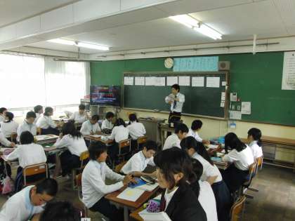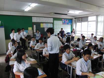 3時間目には、2年3組ににおいて、数学の教育実習研究授業が行われました。若いということの良さでしょうか、元気で明るく意欲満々の様子が伺えました。すでに、研究授業を終えた実習生も授業に入り、グループ活動を支えていました。