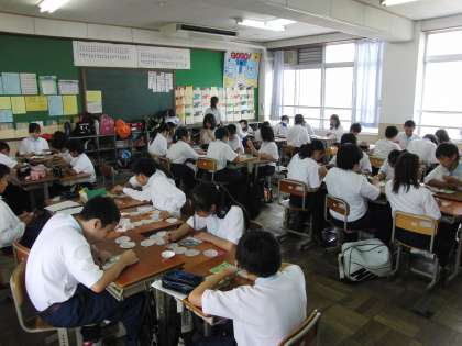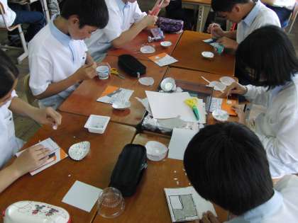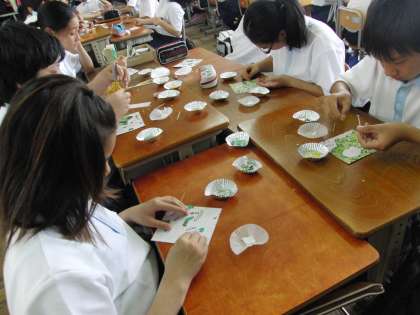 1年生は「自分たちの住む向島〜10年後に残したいもの〜」をテーマに、貼り絵に取り組んでいます。班で協力し合って製作しています。