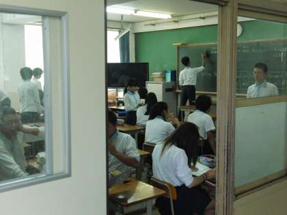 1限終了のチャイムが鳴ったあとも、いつもになく静かで、3年の様子を見に行くと、廊下には先生の姿が見られるものの、生徒の姿はほとんどありませんでした。全員と言っていいほど教室で歓談していました(暑さのせいもあるが)。ある女子生徒が、「チャイムならへんから今日は1日教室にいよかな」と言っていたそうな。ある意味、意識のある証拠かな。次は1年生の様子を見に行こう。