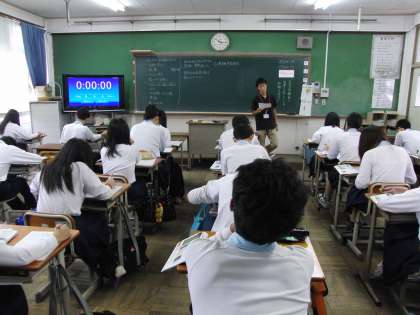 3年生の社会科では、タイマーを活用し「日本の文化」についての学習をしています。指示された時間にワークシートに書き出し、みんなの意見を発表しあいます。しっかり考え、自分の考えを書くことはどの教科でも大切です。