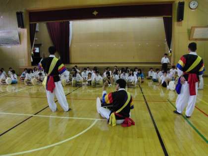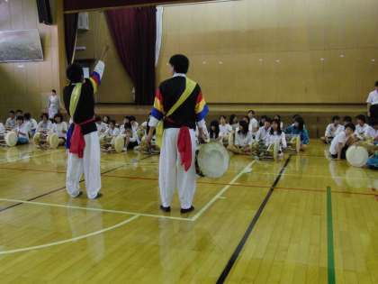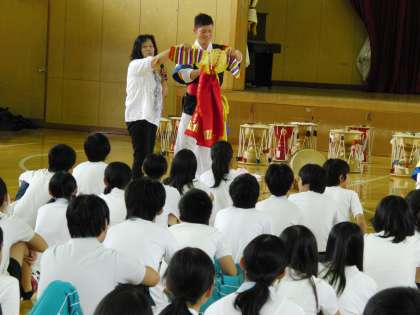 4日(水)午後、2年生は国際理解教育を行いました。テーマは「さまざまな国の文化を体験しよう」で、1年で培った多文化尊重の態度を発展させることをねらいとして、体験を通して外国の文化について学びました。内容は朝鮮半島の文化で、楽器の紹介とともにチャンゴの体験などを行いました。
