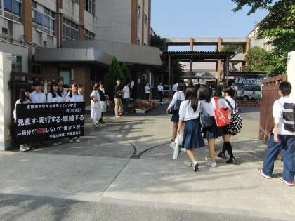 毎月10日は「生徒十訓の日」です。朝の登校時、生徒会本部役員が生徒会サミットで採択されたスローガンを持って、挨拶運動を行いました。「おはようございます」・・・元気な挨拶で一日の始まりです。