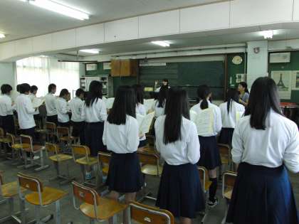 9日(月)から音楽コンクールへ向けての練習期間に入りました。体育館・音楽室・教室・廊下で、全体やパート別練習に励んでいます。6限後の取組時間帯になると、校舎が歌声で包まれます。