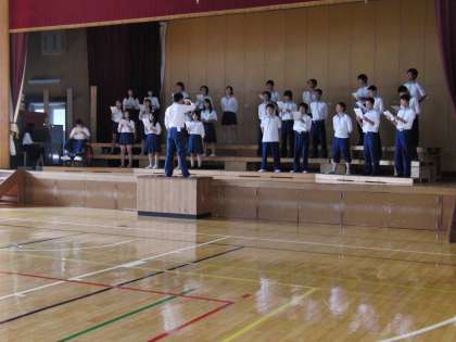 体育館ステージでの練習風景。教室では大きく感じても、広い体育館では「もっと声を出さないと・・・」と感じるのではないでしょうか・・・。当日は観客席の後ろまで届くように頑張って練習を重ねましょう。