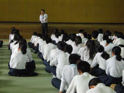 2年生は11月に「生き方探究・チャレンジ体験」にのぞみますが、その事前学習のひとつとして社会人のかたの講話をお聞きしました。講師は旅行会社のアドバイザーのかたで、仕事をする上で大切なことは「相手の立場にたって考えること」であることを強調されました。