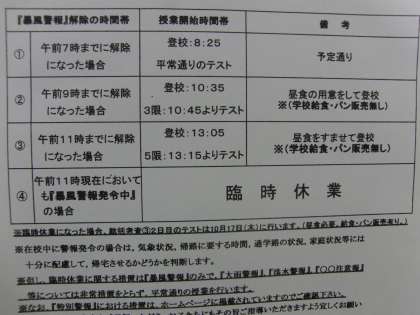 本日、「台風接近に伴う非常措置」に関するプリントを配布しました。今後の風雨や河川の増水に気をつけて下さい。なお、明日の予定については、プリントに記載されている通りになりますのでよろしくお願いいたします。