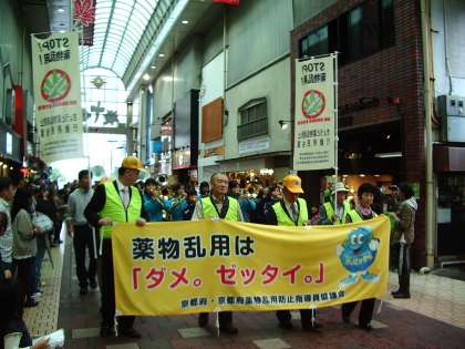 20日(日)午後2時から伏見区大手筋において、「薬物乱用防止啓発活動」が行われ、向島中学校と向島東中学校の吹奏楽部が合同でパレードを行いました。お店の方や買い物に来ておられた方々も足を止め、バレードを見守って下さいました。