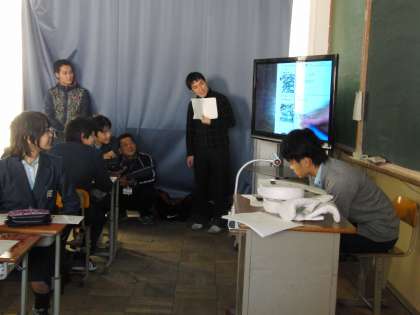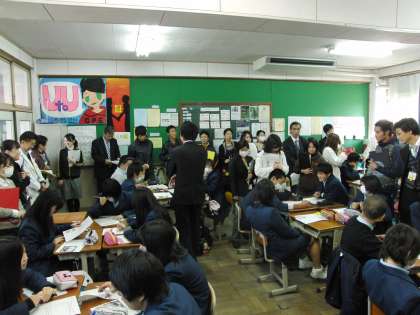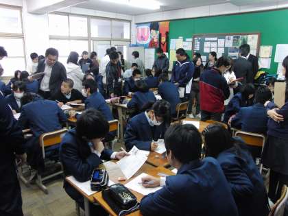 21日(木)6限、3年生において数学科の研究授業がありました。単元は「図形と相似」の中の「相似の活用」で、アニメーションの動画を見て相似比について考えるものでした。まず各自で推論したものをグループ学習で「学びあい」を行い、生徒が拡大投影機を使って解への道すじを説明しました。
