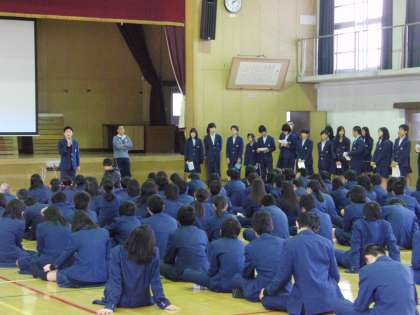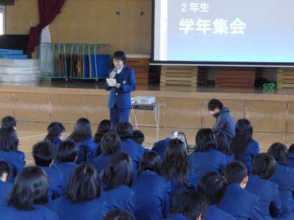 2年生において、学年集会が行われました。代表委員会、生徒会本部が中心となって学年集会を運営しました。修学旅行を控えた今、2年生には、たくさんの課題がある。この課題をみんなでしっかり見つめ、解決し、修学旅行に臨もうと、それぞれの代表委員から、クラスの課題について発表がありました。この集会を機に、それぞれのクラスで課題を解決していくための話し合いががもたれます。本当に良い取組です。充実した話し合いが持てることに期待したいと思います。