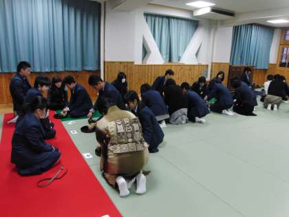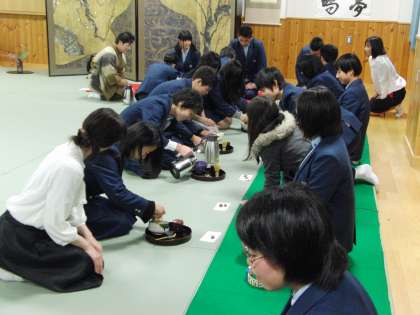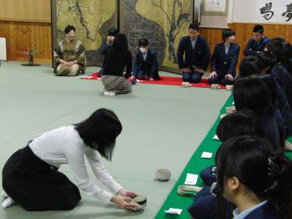 2限は2組が茶道体験を行いました。まずお干菓子をいただき、続いてたてていただいたお茶をいただきました。作法も学びました。そして2人ペアになってお茶をたてる体験をさせていただきました。
