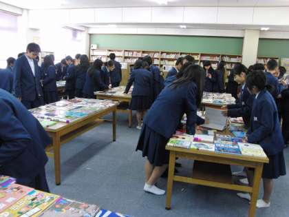 今日からブックフェアー(選書会)が始まりました。今日の昼休みは、1年生が図書室で購入を希望する本に付箋をつけていました。