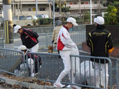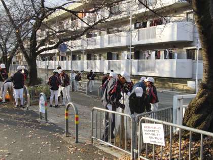 地域の外周道路は、落ち葉でいっぱいです。高齢者の方が時々、落ち葉拾いを行っています。その姿を見た生徒たちが、部活動を返上して、地域で落ち葉拾いの奉仕活動を行いました。野球部が先頭に立って始めると、その後、女子バレー部や男女バスケットボール部も駆けつけ一生懸命取り組んでいました。