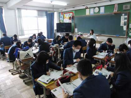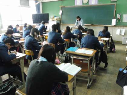 総括考査を控え、入試を控え、3年の授業の様子が気になりました。この時期だから、演習を中心とした授業が多く、一つでも多くのことを吸収しようと一生懸命です。1組では数学、2組では理科、3組では国語の授業が行われていました。教え合いの場面もあり、いい空気が流れていました。