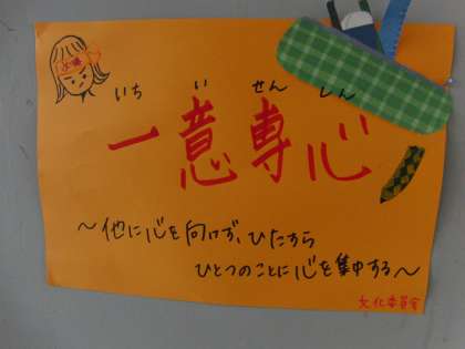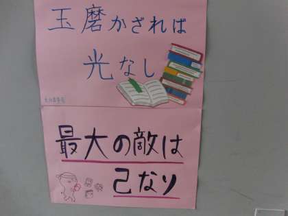 3年生の廊下に文化委員会が作成したポスターが掲示されています。ポスターに書かれているどの言葉も、今こそ心がけたいひと言です。学校で習っていることを、家に帰ってどれだけ予習・復習できるか。学校での授業はもちろん大切ですが、家庭での学習も大事です。机に向かうのか、ゲームやテレビに向かうのか・・・やはり「最大の敵は己なり」ですね。