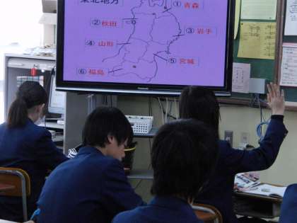2年生の社会科では日本地理の学習をしています。今日は「東北地方」の単元で、キーワードから学習内容を深めるという方式で授業が行われていました。