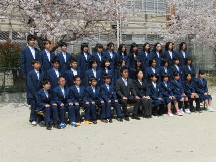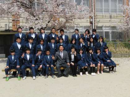 桜がまだ間に合いました。学級写真の撮影です。一人一人の顔が頼もしく見えます。1年後は、もっと逞しくなっているんでしょうね。頑張れ生徒諸君!