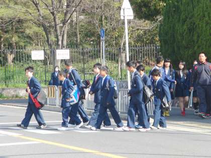 肌寒くはあるものの、暖かな爽やかな朝です。大きなカバンを肩からぶら下げ、生徒が登校してきました。たぶん1年生だろう。初々しさが感じられます。このあと、生徒は、大きな声で「おはようございます」とあいさつをし、教室に向かった。
