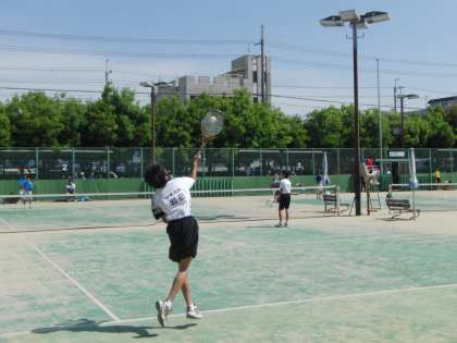 西院コートで、昨日に続いて男子の個人戦が行われました。暑いぐらいの日差しの中で、