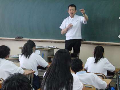 先週に引き続き、京料理「清和荘」の竹中 徹男様に来校していただき、1年生1組・3組で講義をしていただきました。出汁のうまみ・出汁の種類・一番出汁や和食の良さ・和食の心について話を聞き、実際にうまみ体験もして出汁を味わいました。
