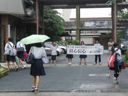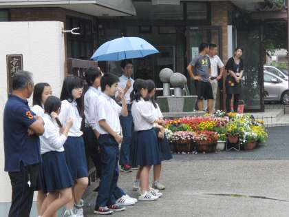 7日から10日までの4日間を「生徒十訓バッチリ週間」として、生徒会が活動しています。夏休みを前に、生活習慣や授業態度を振り返り、自分たちの学校生活に目を向ける意識や態度を育むことを目的としています。今日は雨の中、朝早くから啓発活動に取り組んでいます。