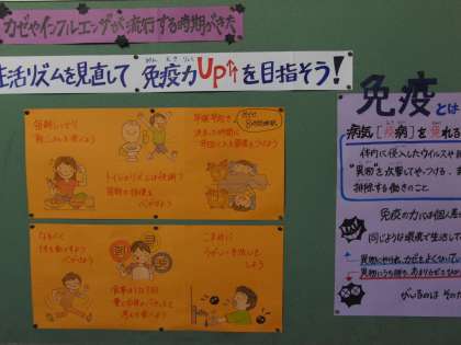 朝夕とめっきり寒くなり、寒さ厳しい冬の足跡が聞こえてきました。保健室前の掲示物も衣替えしました。これからの季節、風邪、インフルエンザに要注意です。健康的な生活で自分の体調管理をしっかり行いましょう。まずは、手洗い、うがいの励行を!