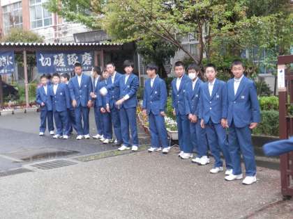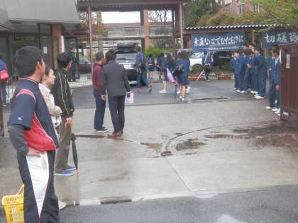 野球部員が、朝から校門に立って部員の勧誘を行っています。