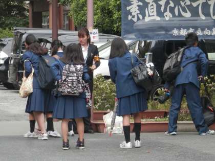 朝の校門では、学級写真の申し込みが行われています。