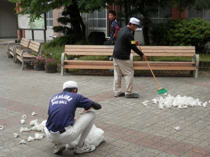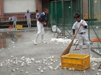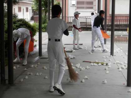 グランドが空くまでの間、野球部は中庭でシャトル打ちです。